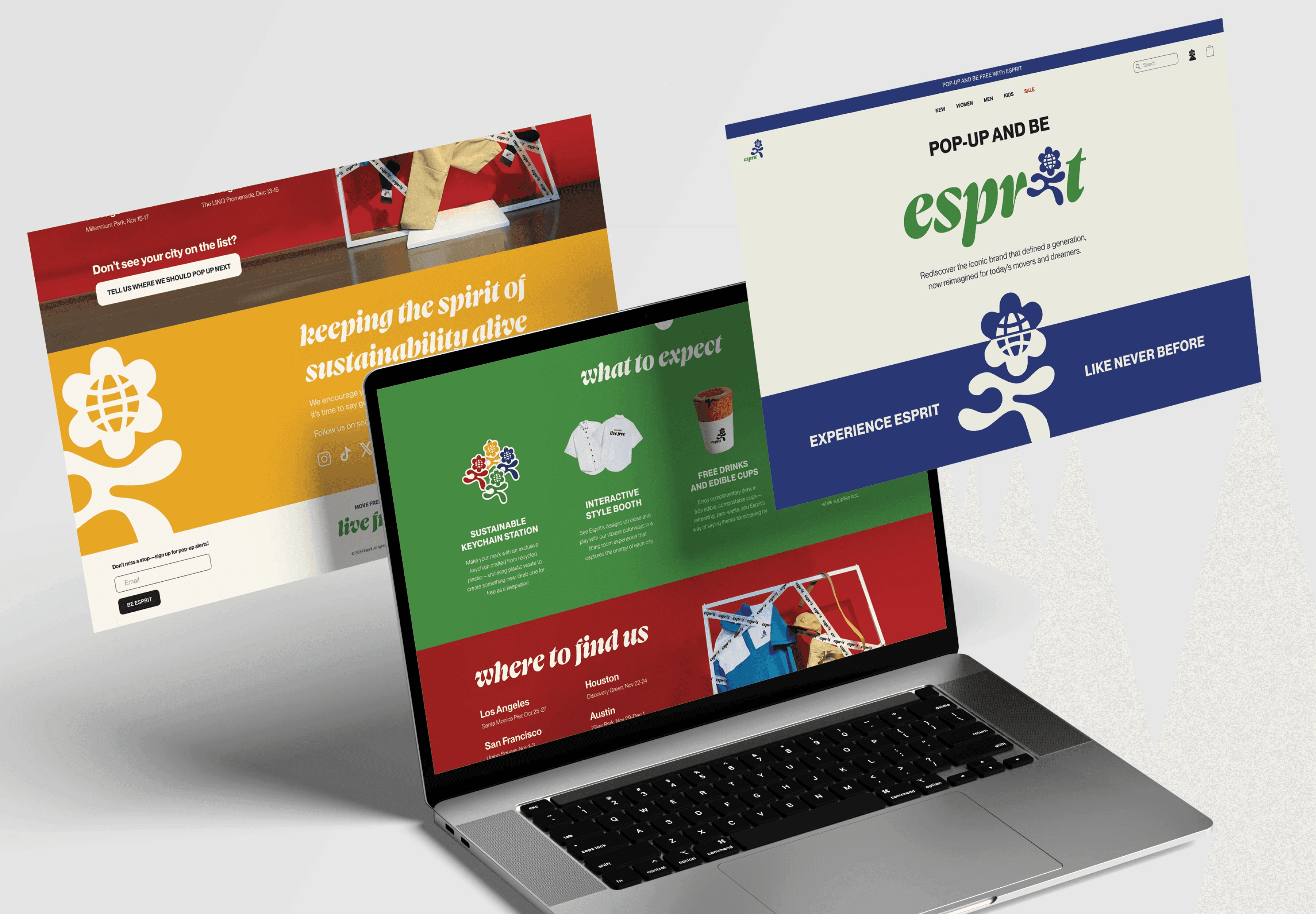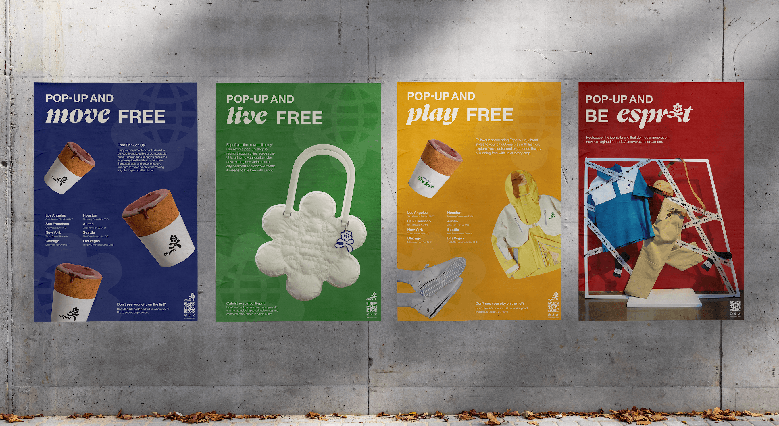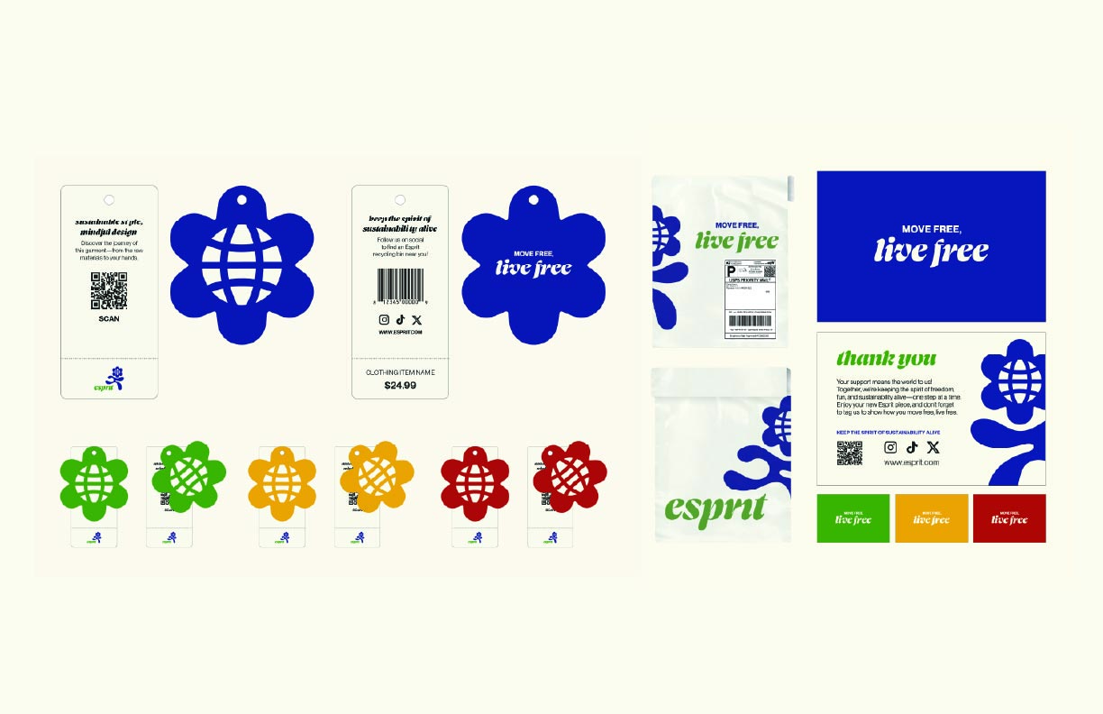 Strategically, the work expands Esprit beyond apparel into an ecosystem of experience—including pop-up activations, digital storytelling, AI-assisted retail, and sustainable material systems—positioning the brand as a connector between community, technology, and responsible production. The rebrand centers the idea that fashion is not just product but participatory identity and global community building, aligned with the mission to help people “move freely, live freely, and express authentically.”