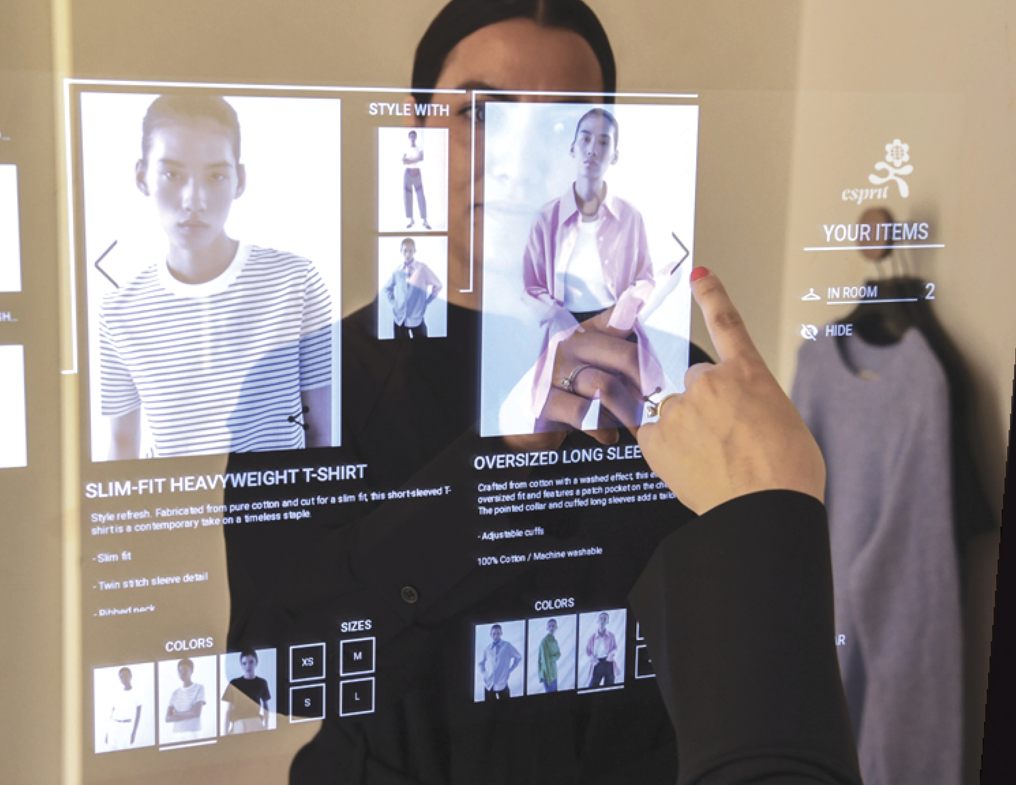 The smart mirror interface reflects Esprit’s commitment to merging technology with self-expression, enabling personalized fashion discovery.